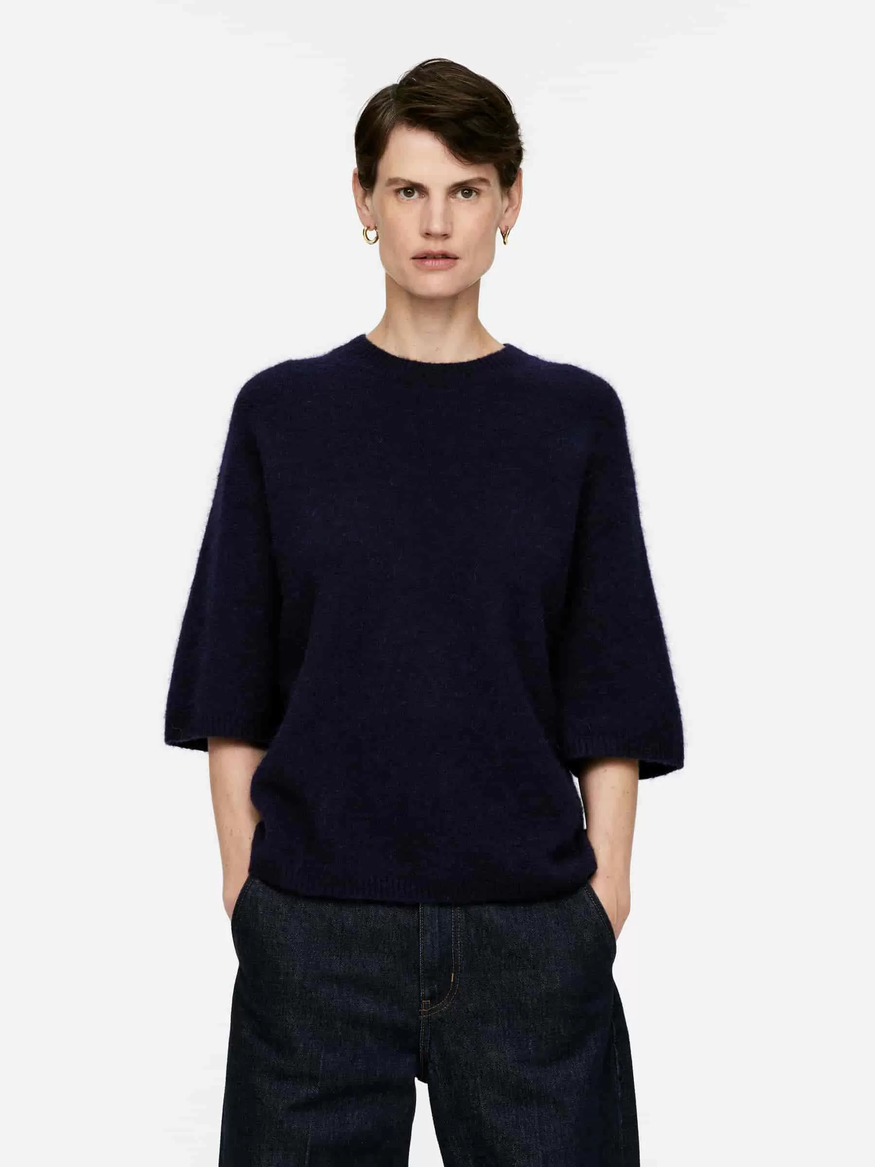 Kortærmet trøje lavet med komfortinducerende alpaca og uld. En rund hals-stil med en løs pasform. Ribkantede detaljer detaljeret looket. Denne style indeholder 31% RAS Alpaca og 31% RWS uld (TE-00047206). Produkter certificeret i henhold til Responsible Wool Standard (RWS) og Responsible Alpaca Standard (RAS) indeholder uld og alpakafibre fra gårde, der er uafhængigt certificeret til dyrevelfærds- og jordforvaltningskrav.