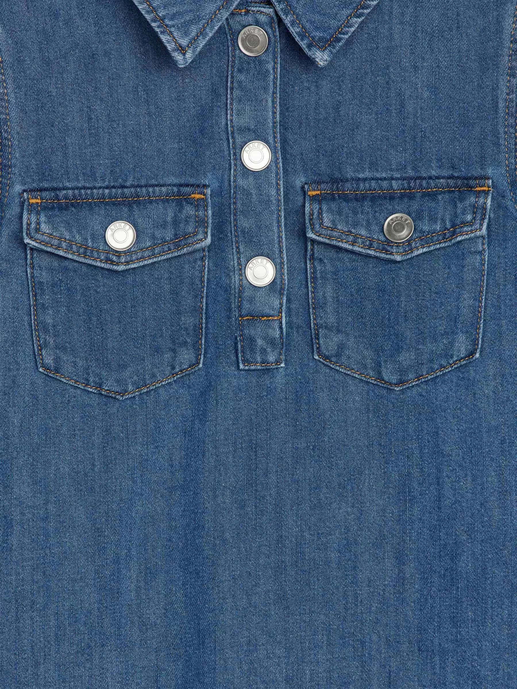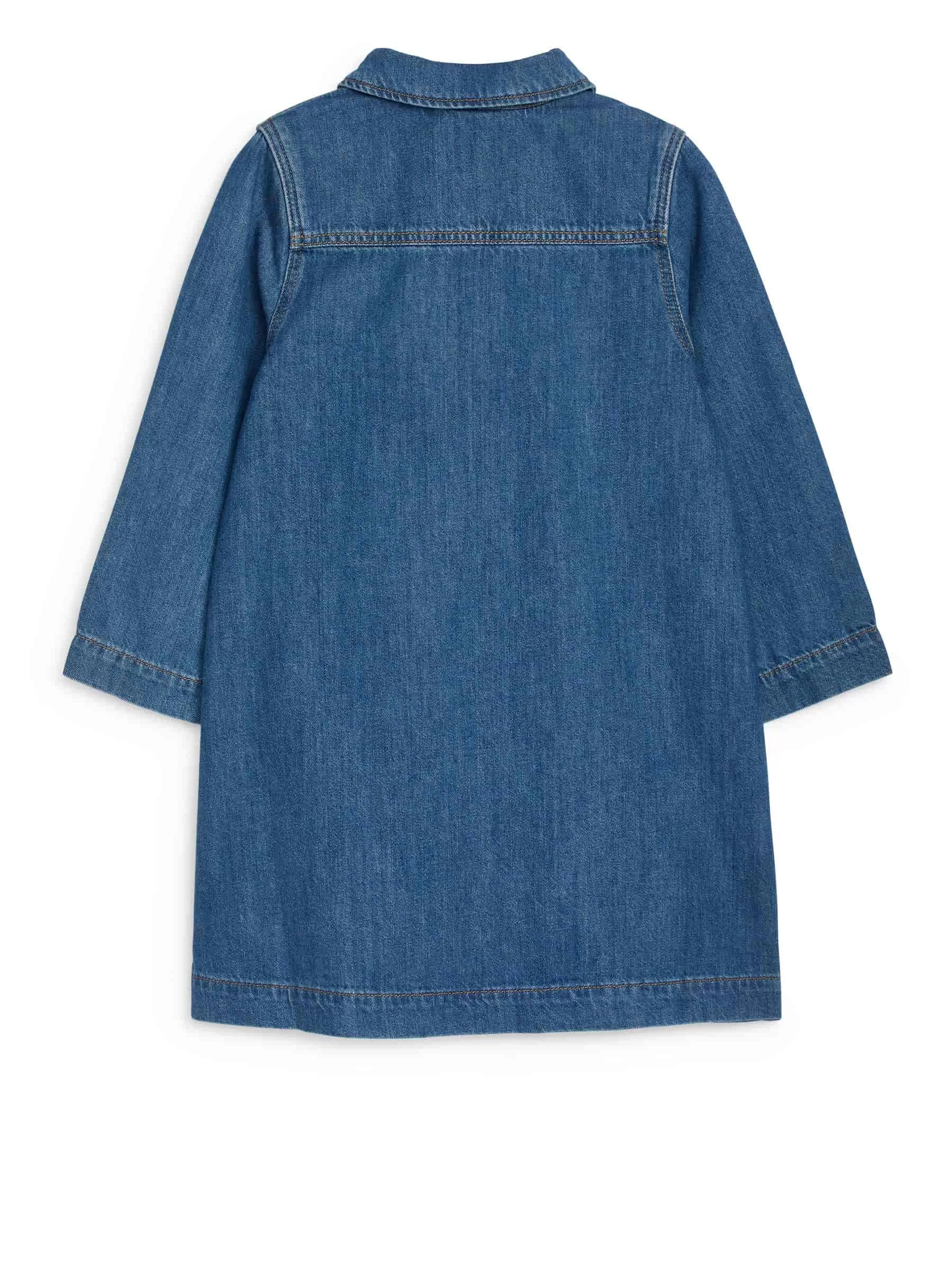 Langærmet denimkjole lavet af en bomuldsblanding. Skjortekrave og halvlomme med trykknapper. Lommer med trykknapper foran.