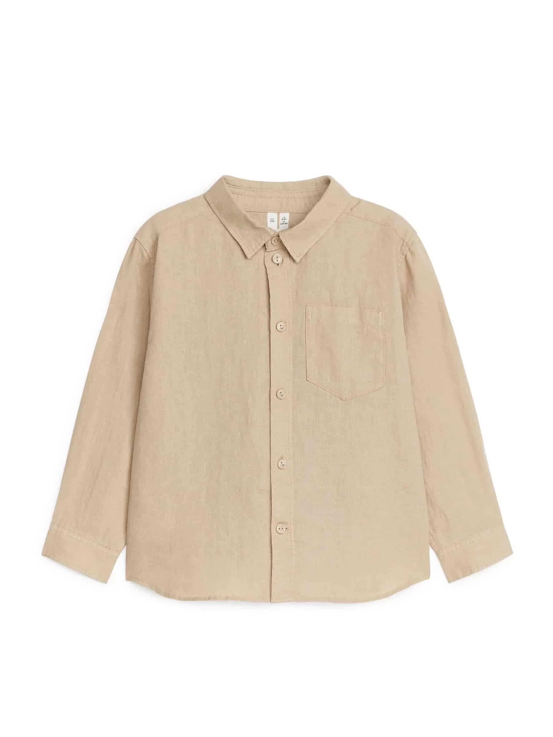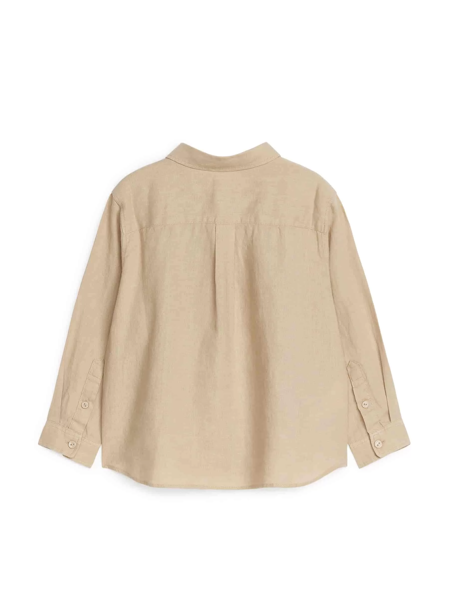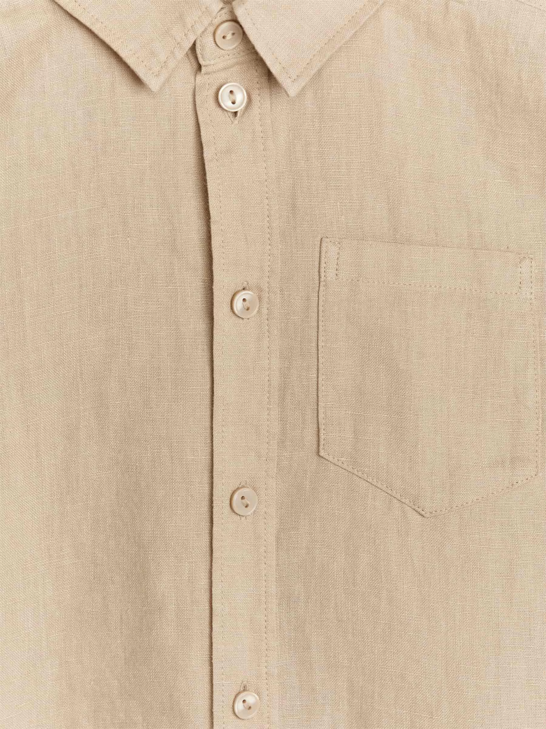 Løreskjorte skåret til en normal pasform. Stylet med en almindelig krave, knappning foran og en påsyet lomme på brystet. Manchetter med knap. Buet kant.