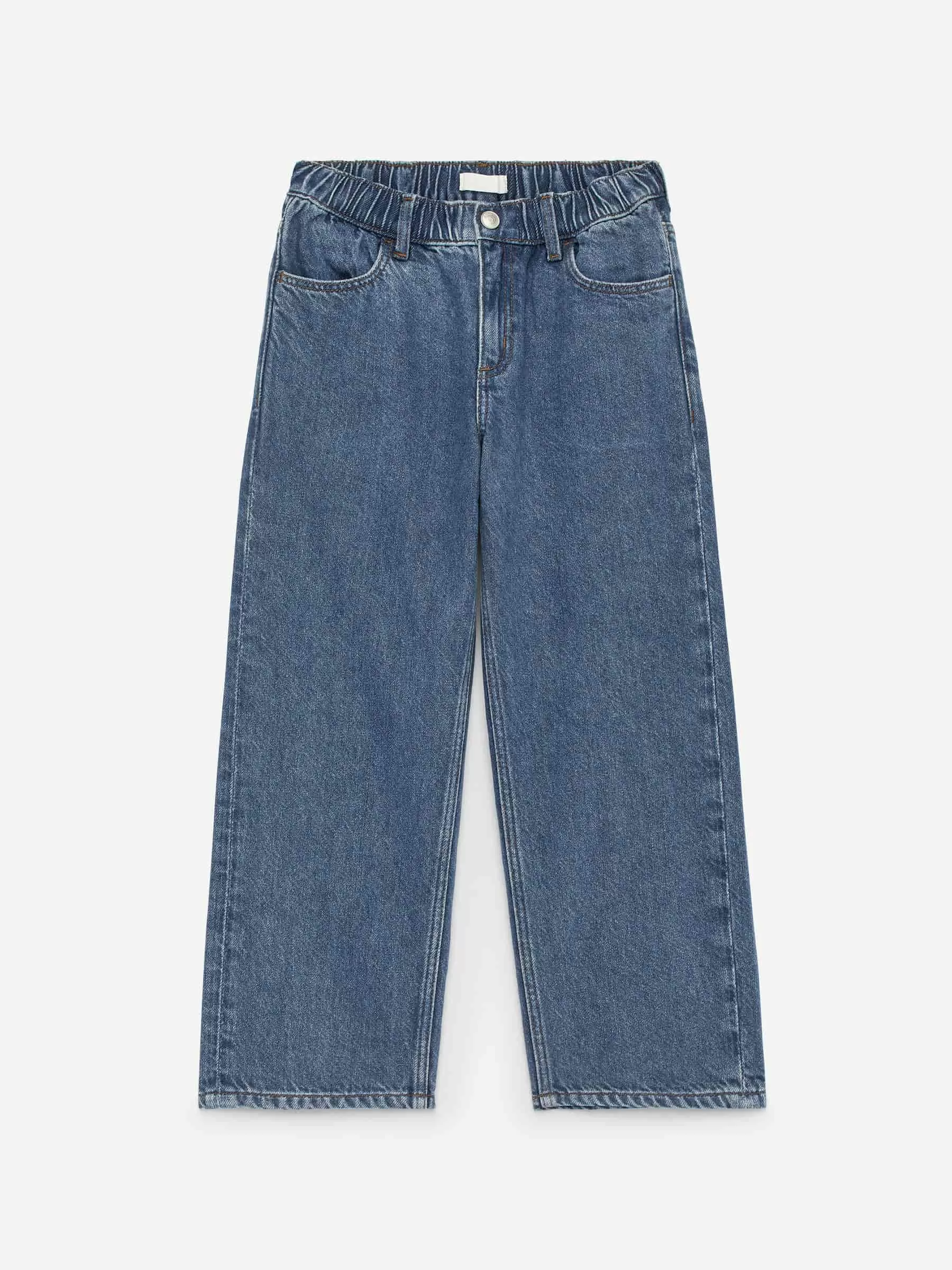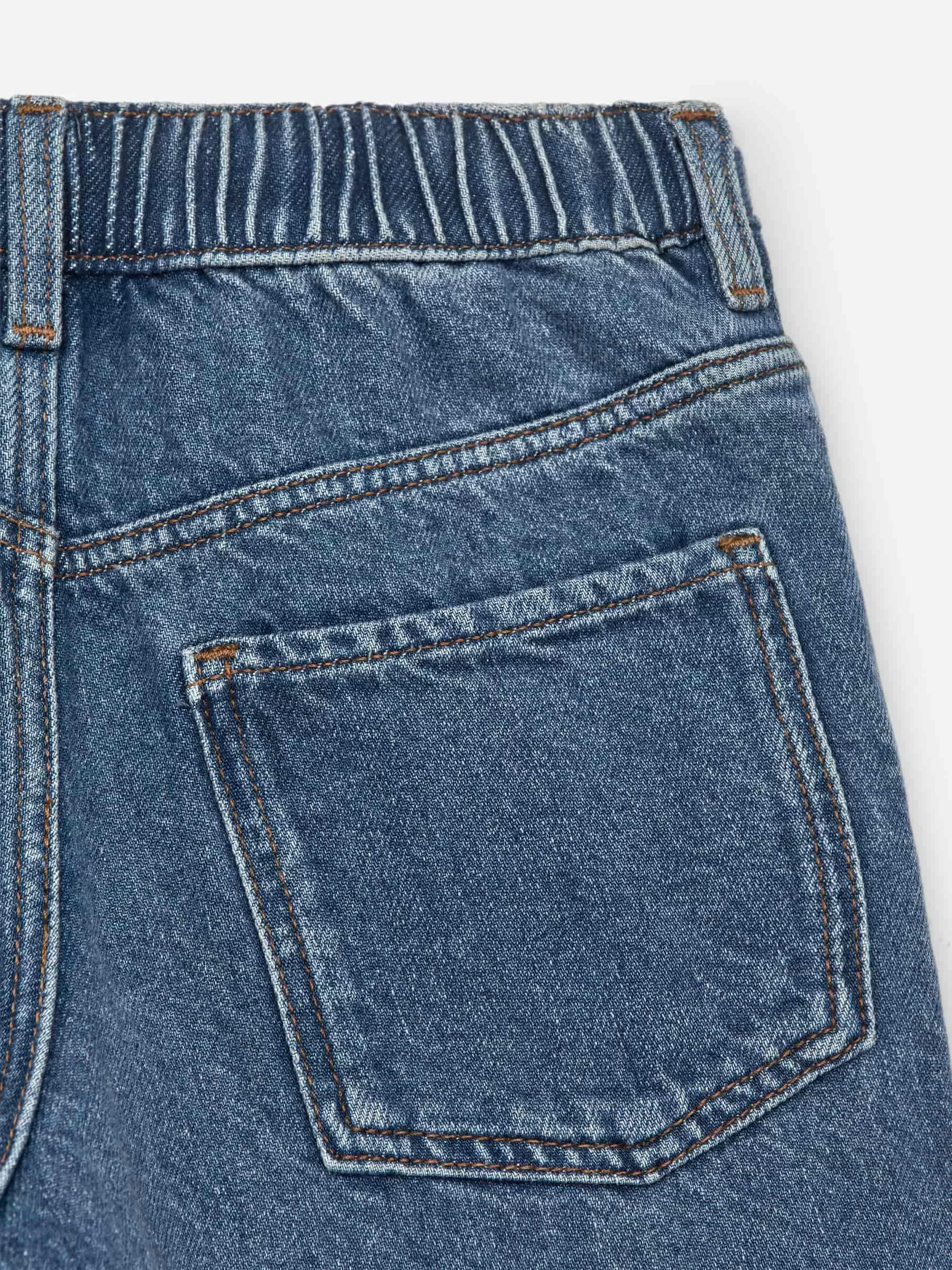 Pull-on denimbukser med justerbare elastikker i taljen. Detaljeret med trykknap-lukning og metallynlås samt for- og baglommer. Løs pasform.