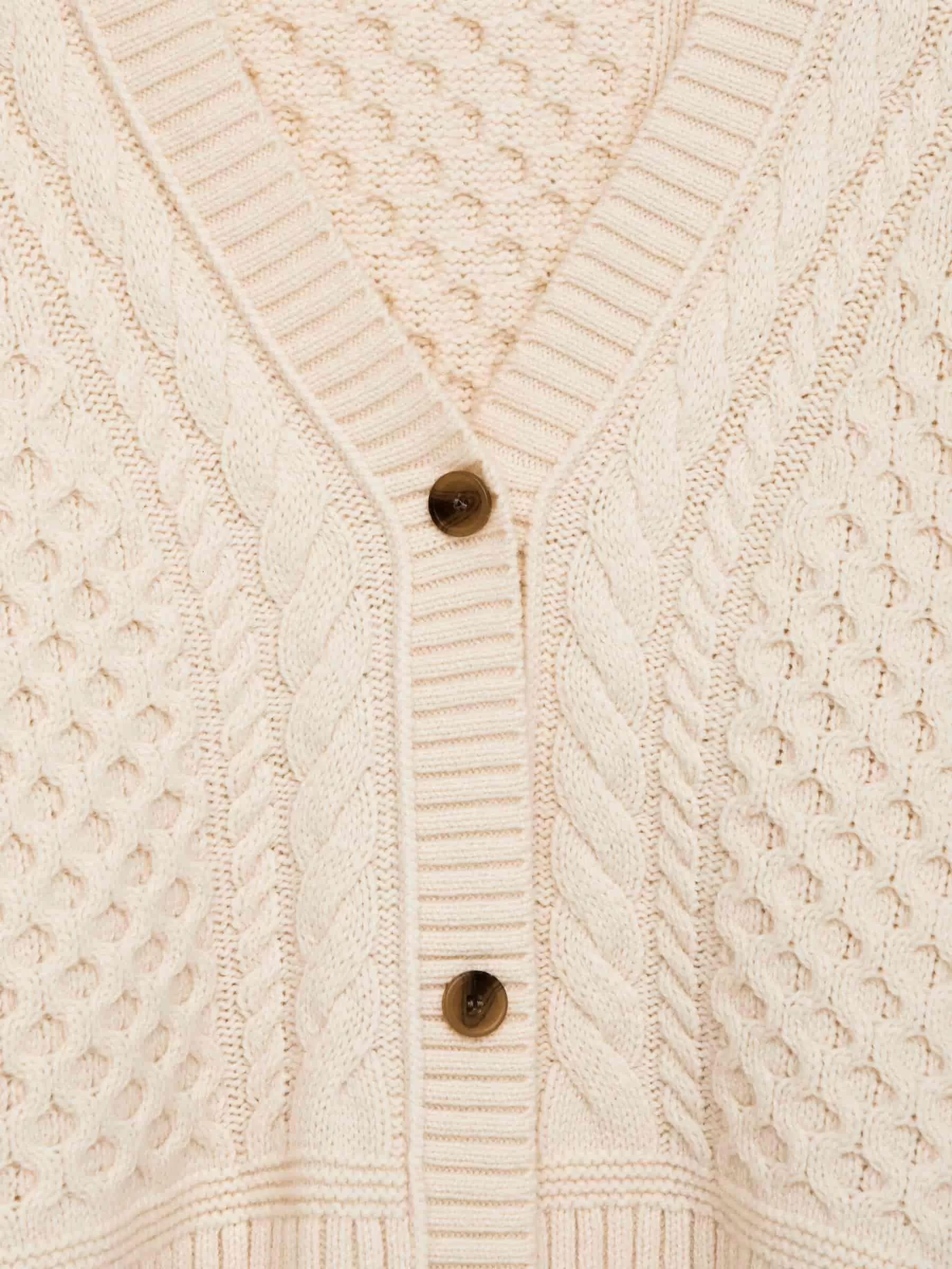 Cardigan med kabelstrikket mønster lavet af uld. Stylet med V-udskæring, tre-knaps lukning og ribkanter. Normal pasform. Cardiganen indeholder 100% RWS uld (TE-00047206). Produkter, der er certificeret til Responsible Wool Standard (RWS) indeholder uldfibre fra gårde, der er uafhængigt certificeret til dyrevelfærds- og jordforvaltningskrav.