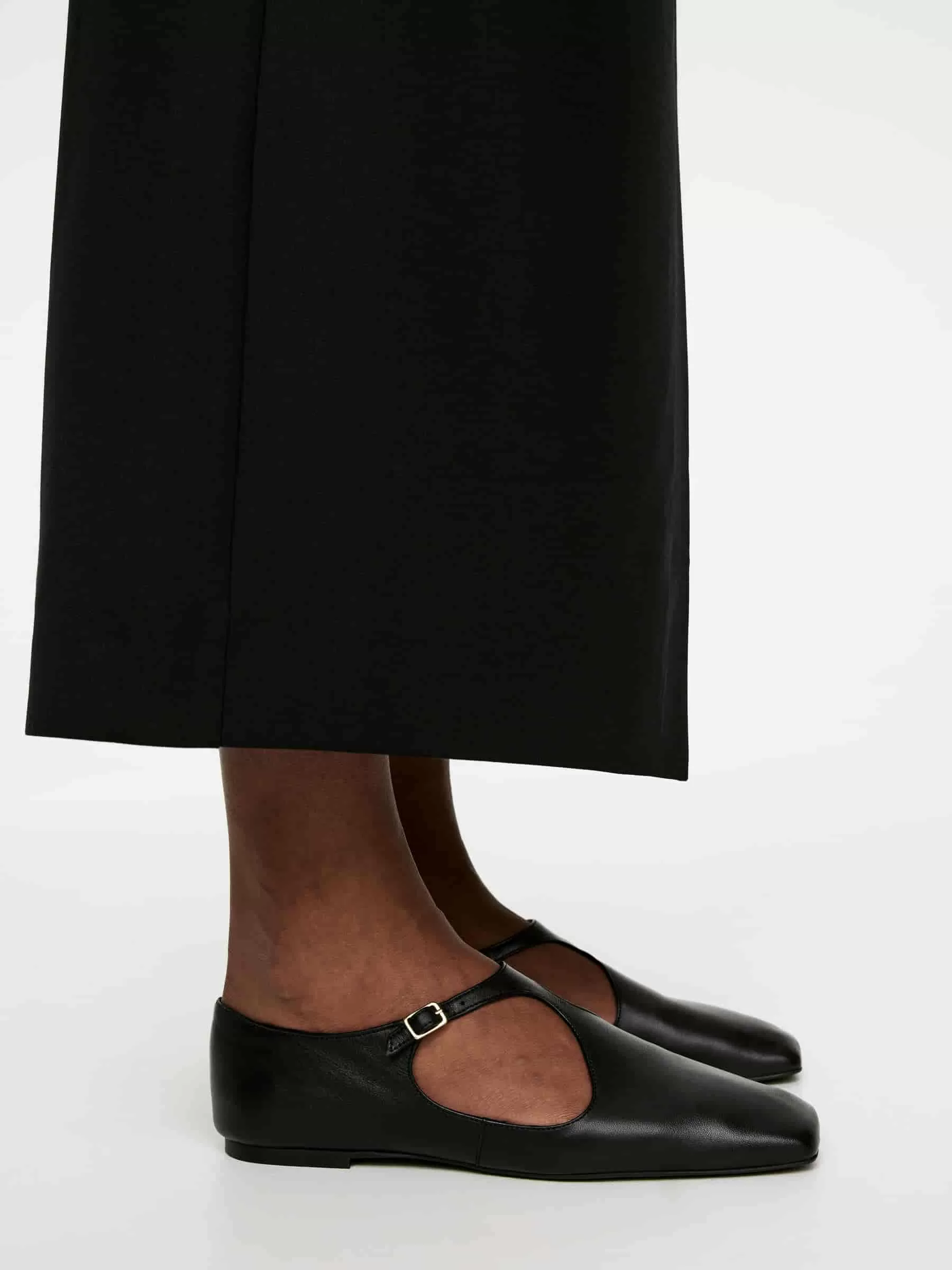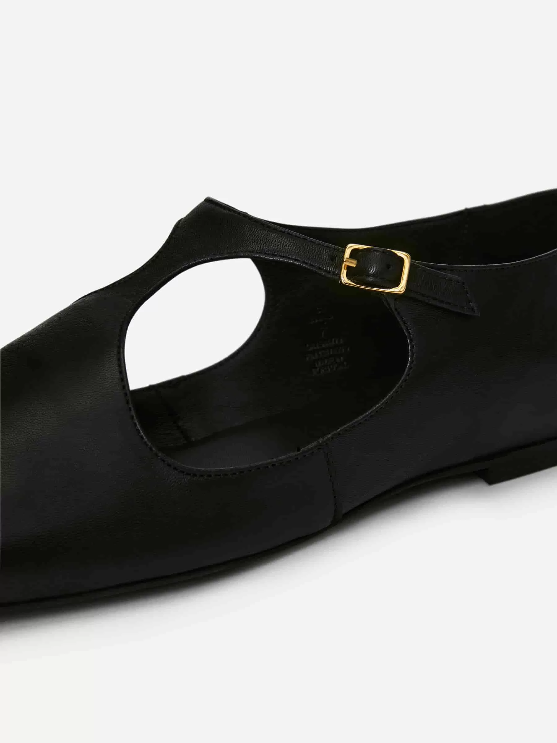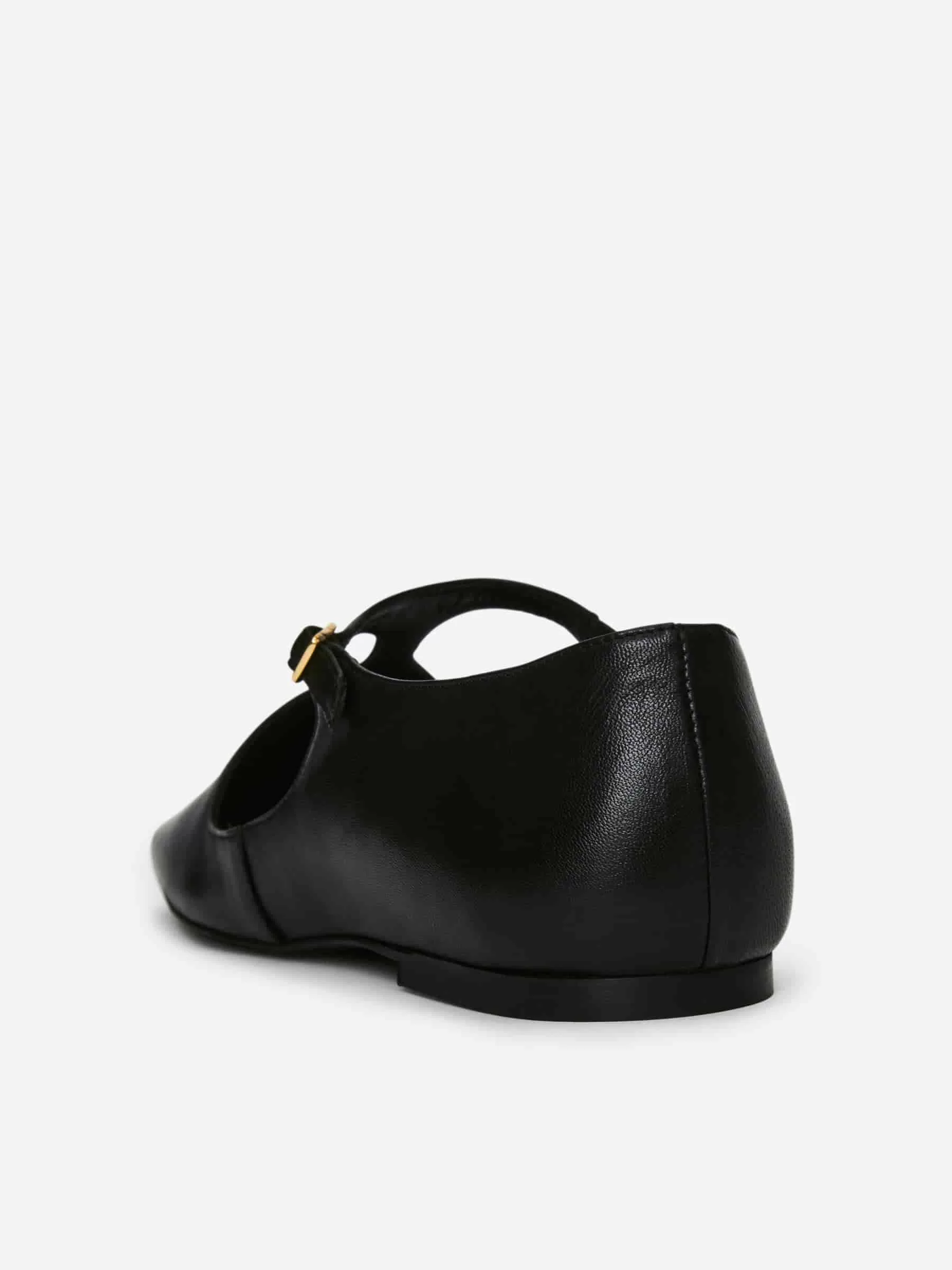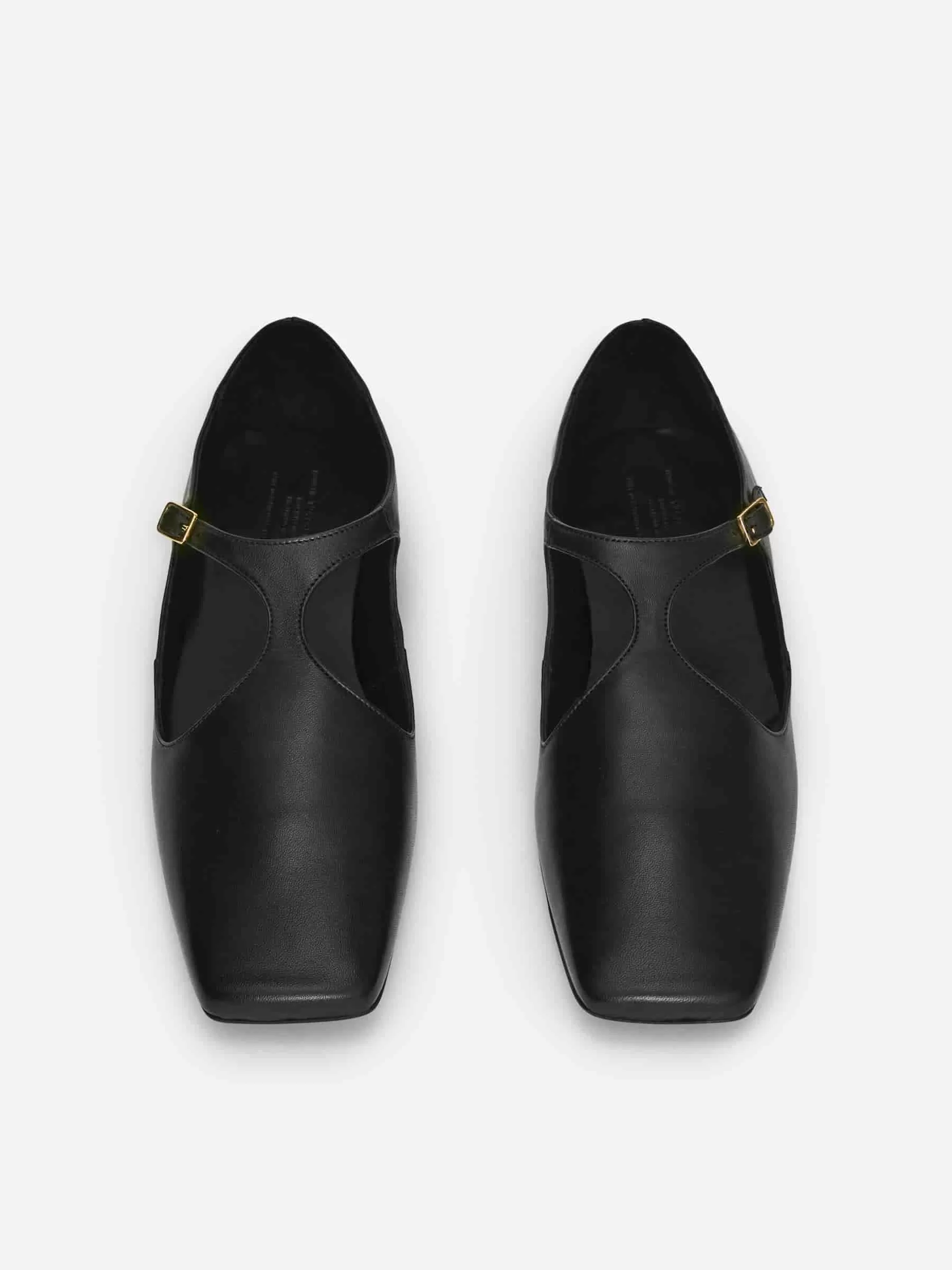 Flade læder med et guldfarvet spænde og en firkantet tå.