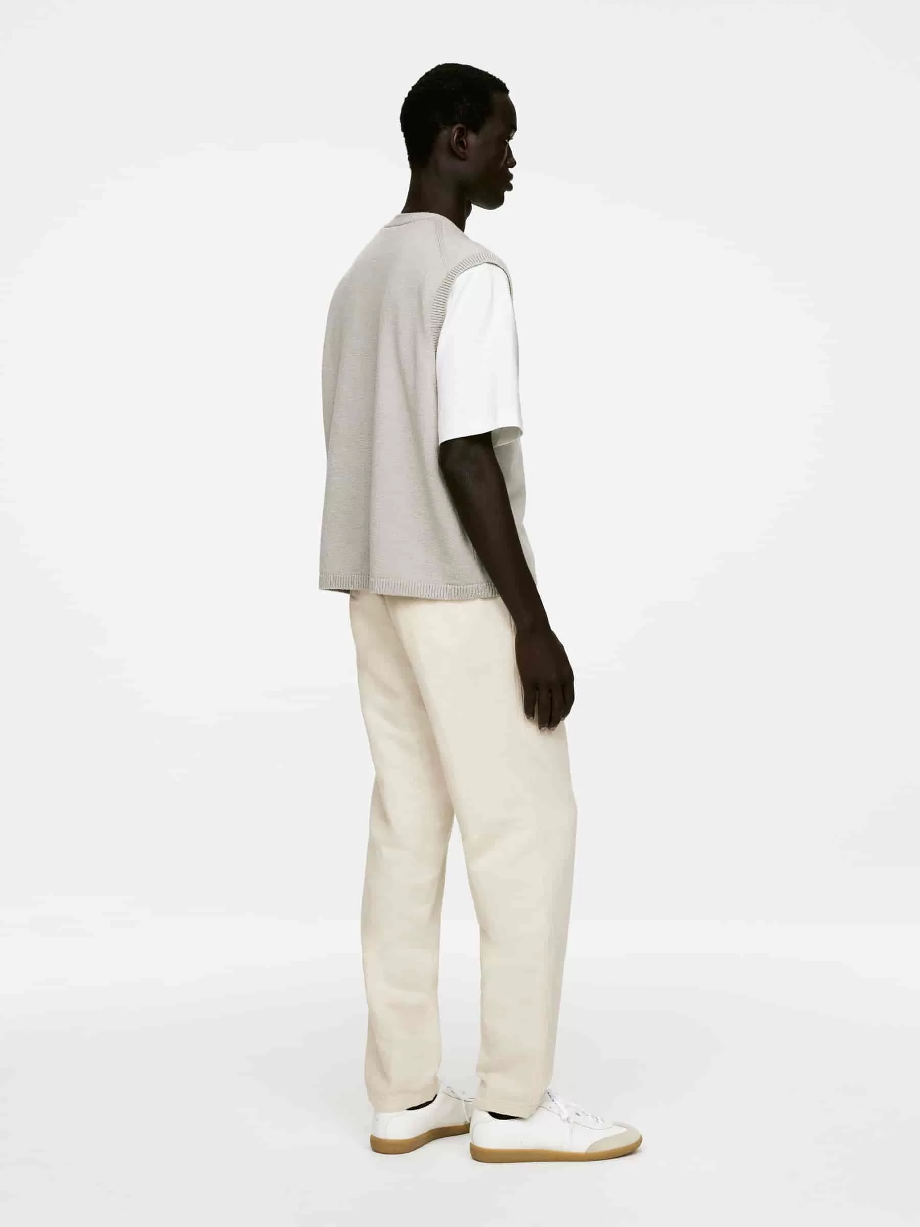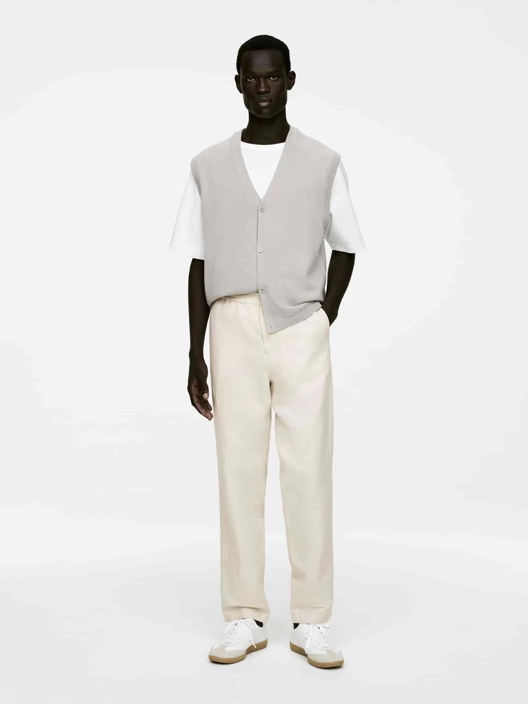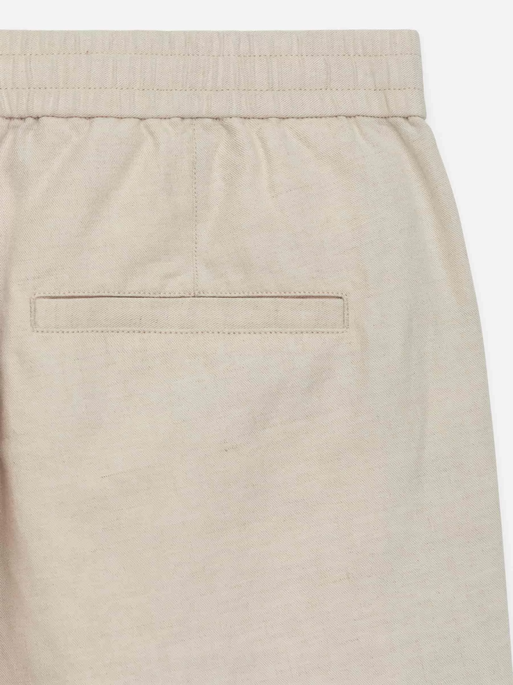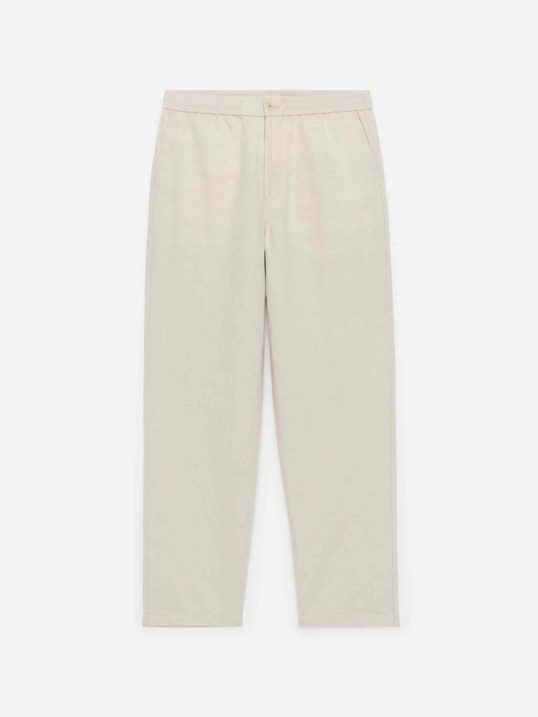 Bukser syet af en hørblanding. Detaljeret med elastisk linning med snøre på indersiden, knaplukning og lynlåsgylp. Skrålommer foran og paspolerede lommer bagpå. Normal pasform.